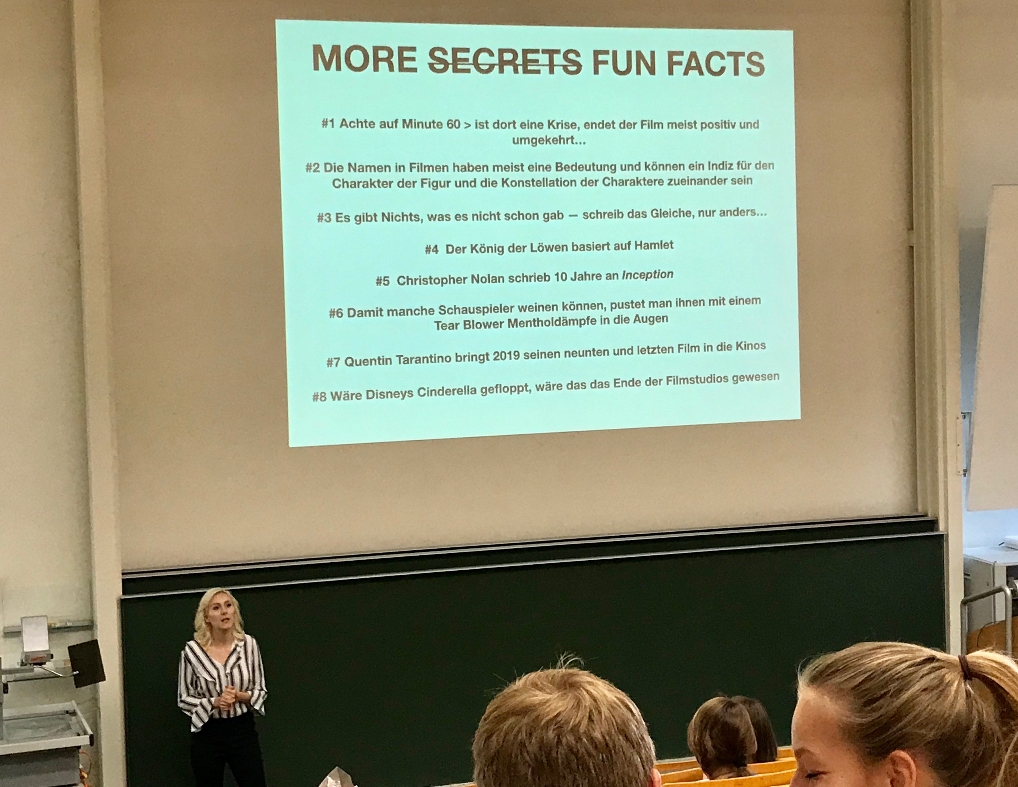 Begonnen hat der Tag mit Jane Engels Vortrag „Filmgeheimnisse – warum wir Filme lieben“. Dabei nahm sie uns mit auf eine Heldenreise durch verschiedene Filmklassiker wie Titanic, die Monster AG und Matrix. Als Produzentin bei Kastor & Pollux Productions weiß sie, worauf es bei der Filmanalyse ankommt und konnte so einige Tipps und Tricks verraten, wie man beispielsweise Drehbücher schreibt. Und auch „secret fun facts“ gab es: Wusstest du, dass Christopher Nolan 10 Jahre an seinem Film „Inceptions“ schrieb?