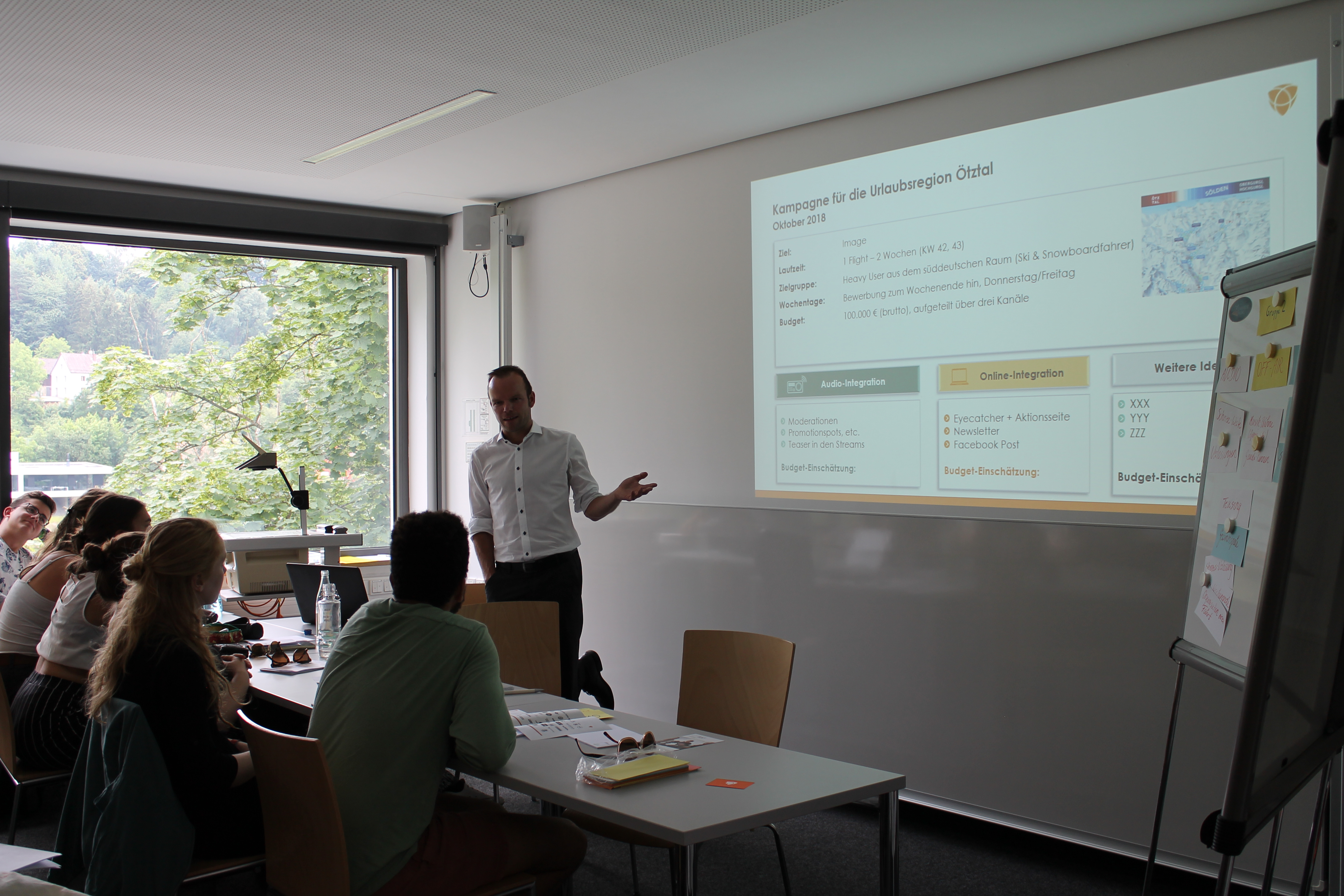 Parallel zu Wagners Vortrag lief David Nowaks Workshop „360 Grad Vermarktung am Beispiel eines Radiosenders“. Er arbeitet als Produkt Manager beim Web Radio von Antenne Bayern. In seinem Workshop stellte er mit seinen Teilnehmern ein Konzept auf die Beine, wie ein Radiosender sich mit einem begrenzten Budget so erfolgreich und effektiv wie möglich vermarkten kann. Nach einer kurzen Präsentation seinerseits durften die Studenten ans Werk und diskutierten unter anderem Themen wie Radiowerbung und crossmediale Vermarktung.