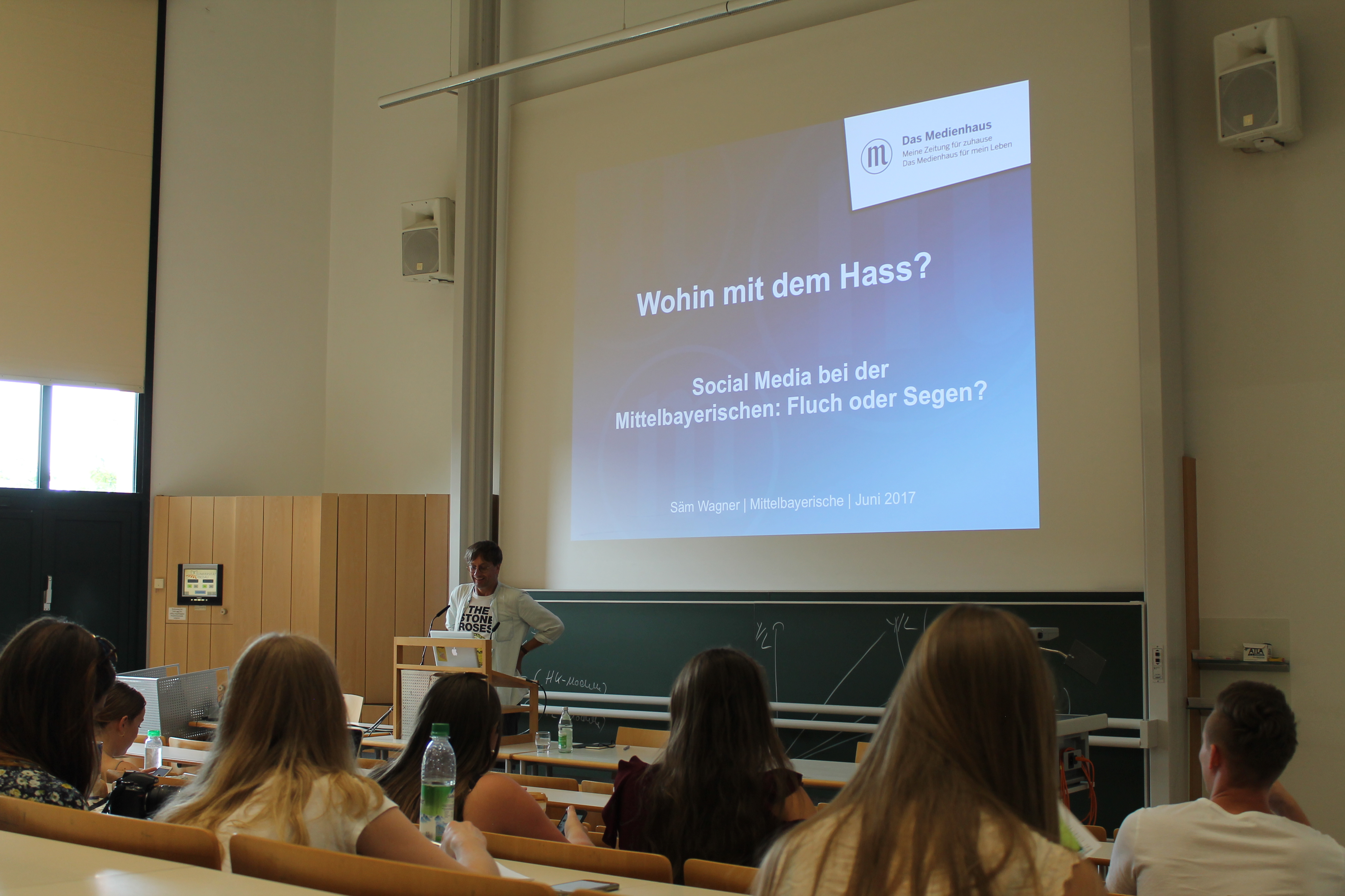 Säm Wagner arbeitet als Social Media Verantwortlicher bei der Mittelbayerischen Zeitung in Regensburg und sprach in seinem Vortrag “Wohin mit dem Hass? Social Media: Fluch oder Segen?” darüber, wie Verlage – insbesondere die MZ – mit Social Media umgehen.