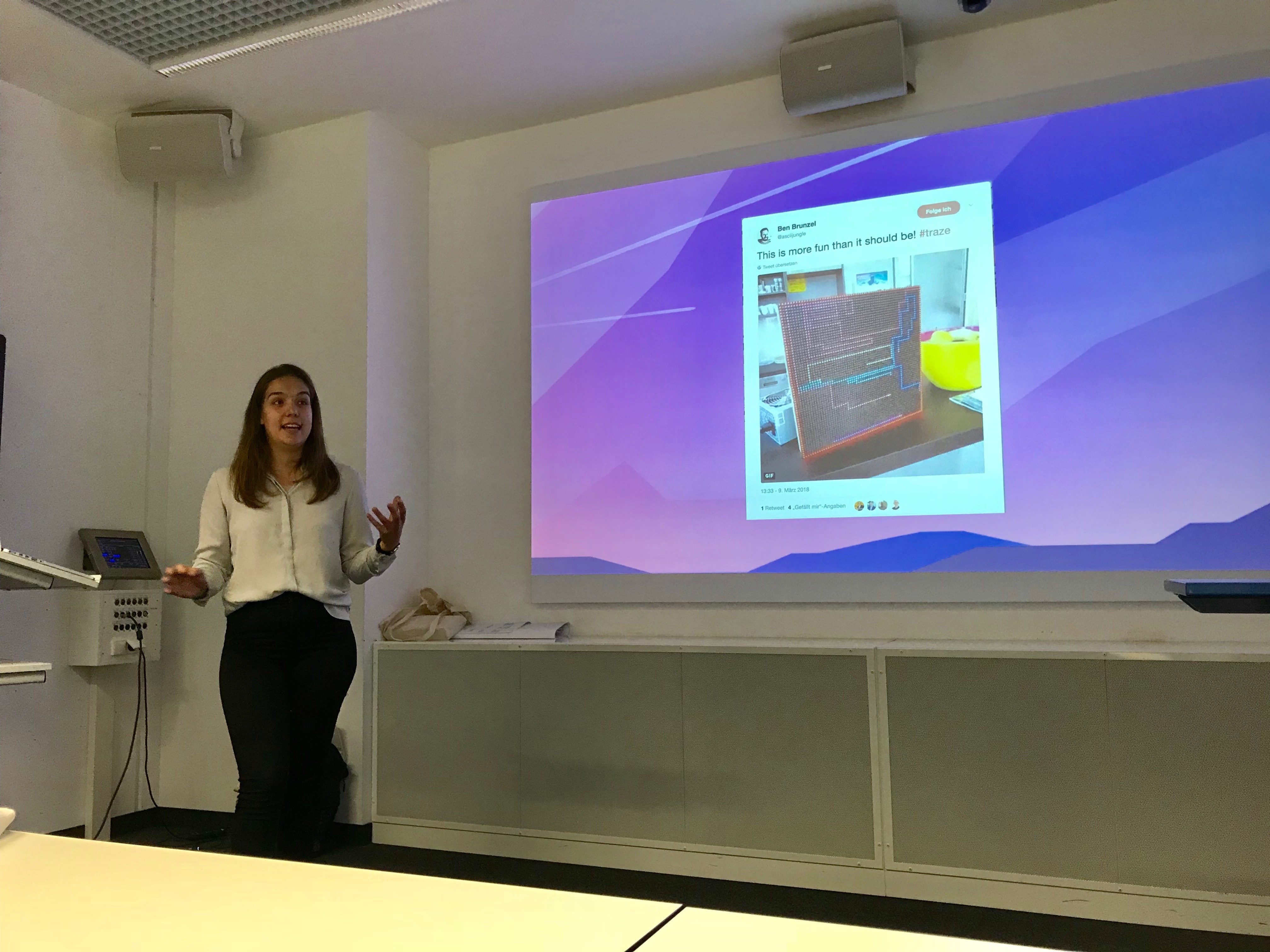 Ellen Weigel, die bis vor zwei Jahren selbst an der Uni Passau MuK studierte, arbeitet jetzt bei iteratec in München als Social Media Managerin. In ihrem Vortrag „Corporate Influencer im Unternehmen“ berichtete sie über ihre Tätigkeiten und ihren Arbeitsalltag. Was genau ein Corporate Influencer macht und was der Unterschied zum normalen Marketing ist, erklärte sie anhand vieler Beispiele aus ihrem Unternehmen. Und sogar ein Onlinespiel, das in ihrer Firma entwickelt wurde, brachte sie mit und ließ es uns ausprobieren.